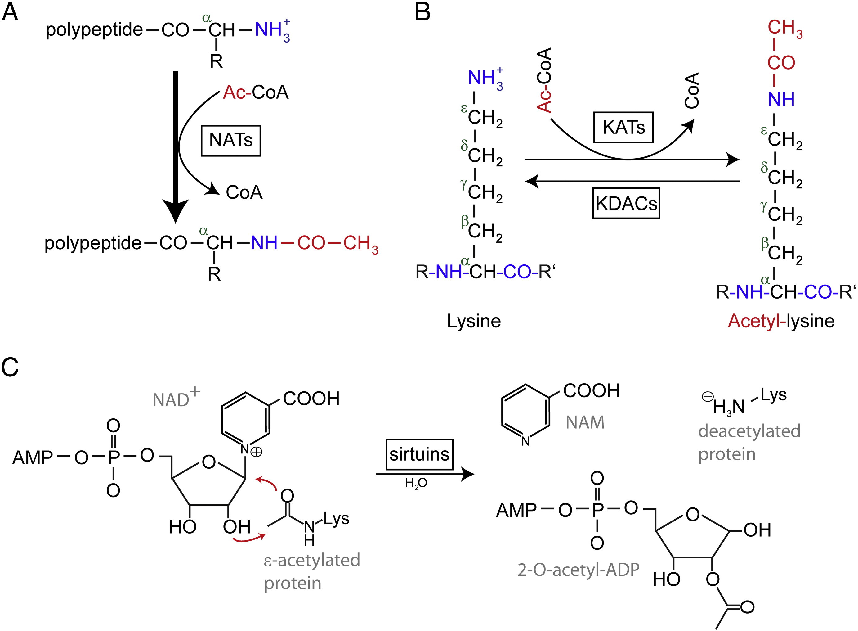 乙酰化赖氨酸残基最早发现于调控基因转录的组蛋白中。但是赖氨酸乙酰化并不局限于组蛋白。与Nt乙酰化不同,赖氨酸乙酰化是可逆的。乙酰化由赖氨酸乙酰转移酶(KATs)催化,赖氨酸去乙酰化由赖氨酸去乙酰化酶(kdac)催化。