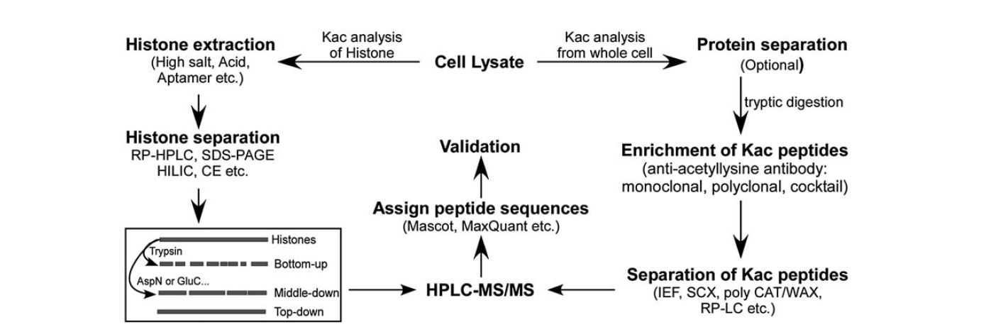 有许多可用于识别乙酰化赖氨酸相对较少的工具。随着质谱的发展,它一直是乙酰化赖氨酸的定性和定量分析的重要工具。为了分析组蛋白赖氨酸乙酰化,有几个步骤,包括细胞裂解物,组蛋白提取,组蛋白分离,质谱,和数据分析。用于分析来自全细胞蛋白的乙酰化的赖氨酸的步骤包括细胞裂解物,蛋白质分离,赖氨酸乙酰化肽的富集,赖氨酸乙酰化的肽的分离,质谱法,和数据分析。