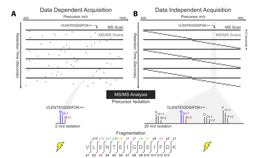 蛋白质组学的目的是完全确定和量化整个蛋白样品,我们感兴趣的是,和质谱是最流行的方法来研究蛋白质组学之一。目前,使用许多不同的方法今天采集数据的质谱仪。数据相关型采集(DDA)模式,也被称为信息关联采集模式(IDA),是数据收集的在串联质谱法的模式。备选toDDA是DIA这是“数据独立采集”的缩写形式。在DDA模式,在一定的质量范围内的所有的肽片段化在串联质谱法。