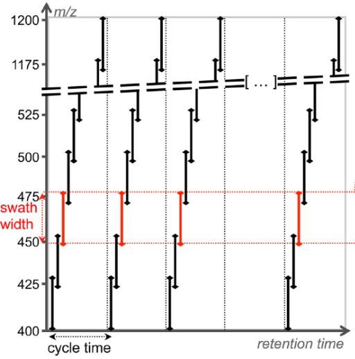 以生成DIA数据的最常见的方法被称为SWATH(全理论碎片离子的SequentialWindowed获取),其中,所述质谱仪分裂的质量范围为小质量窗。在SWATH,AMASS分析器盖400-1200 M / Z作为整个质量范围,并用由前体获取窗2-4seconds周期时间质谱仪步骤。在每个循环期间,质谱仪因而片段的所有前体从四极隔离窗口(如475 - 25个大窗户500米/ z)和在该隔离窗口中选择所有的前体的一个完整的,高精确度的片段离子谱被记录。相同的前体隔离窗口被分段遍地在整个色谱分离在每个周期,从而提供了所有的肽前体的碎片离子的时间分辨记录该洗脱的色谱法。因此被确定性地记录在用户定义的质量的母质量范围和色谱分离高度复片段离子的地图的SWATH MS数据组成。