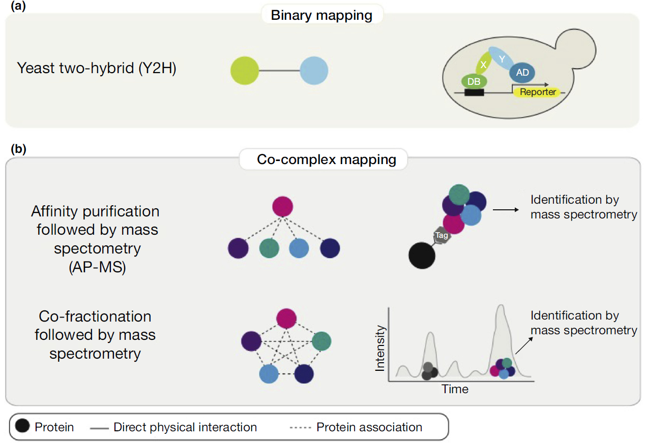 Mapping protein-protein interactions on a proteomics scale reveal the macromolecular connections that underlie the biology of the cell. Although there are many methods for detection PPIs, only a few methods are able for high-throughput mapping. Binary mapping by yeast two-hybrid (Y2H) and co-complex associations affinity purification followed by mass spectrometry (AP-MS) or co-fractionation with mass spectrometry (CO-FRAC) can be adapted to systematically survey the entire proteome, each technique has inherent benefits and limitations.
