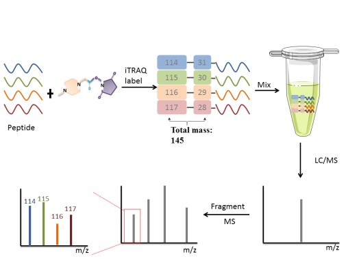 化学标签技术引入了同位素在体外,适用于细胞、体液、组织和其他样品。比较有代表性的方法有相对和绝对定量等压标签(iTRAQ)标记肽n端氨基,酯化标签标记肽c端羧基(-COOH), ICAT标记半胱氨酸硫醇(-SH)等。以下重点介绍iTRAQ。iTRAQ非常适合于比较不同处理、生物重复和提供相对定量的样品。