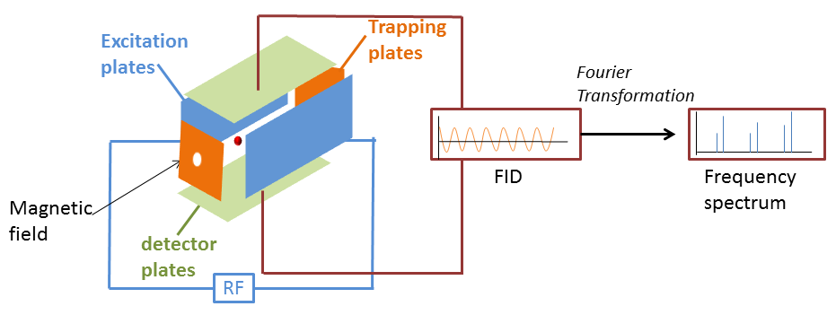 受磁场影响的离子以回旋频率运动。施加与回旋频率相同频率的射频电压后,离子吸收能量并加速到比原路径更大的轨道半径。激发后,离子的回旋半径仍保持较大的状态。当周围的离子靠近顶部和底部时,电子从顶部移动到底部。电子在这两块板之间的运动产生可检测的电流。通过傅里叶变换将应用短射频扫描后产生的图像电流随时间的衰减从时域转换为频域信号。