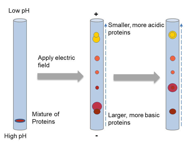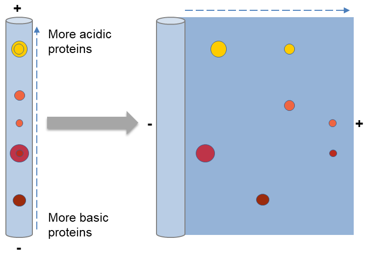 正如我们上面提到的,第一个维度根据蛋白质的pI来分离蛋白质。蛋白质是两性分子,它们携带的正电荷、负电荷或零净电荷取决于周围环境的pH值。等电点(pI)的定义是,当蛋白质的净电荷为零时溶液的pH值。带正电荷的蛋白质会向阴极迁移,带正电荷减少,直到达到pI。而带负电荷的蛋白质会向阳极迁移,负电荷减少,直到达到pI。