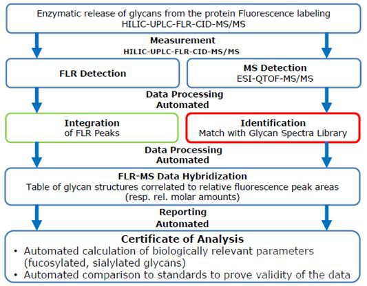 为了应对这一挑战,glytope和Brooke合作开发了一个专门用于释放聚糖分析的工作流,该工作流将布鲁克的高分辨率QTOF数据与UPLC通过GlycoFiler软件生成的荧光色谱相结合,并提供自动化、可靠的糖基化定性和定量分析过程。