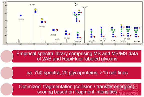 目前糖基化鉴定分析基于液基保留时间(如GU值)和一级准确质量,可用于糖基化相对简单的单克隆抗体样品,但对于糖基化较复杂的样品(如整合素、糖基化位点单克隆抗体、血液因子、等),Bruker和GlycoTope联合推出糖基化分析程序,通过MS/MS数据搜索糖苷库,鉴定糖苷结构。内置的糖苷库包含750多个糖苷实验质谱(糖苷的MS和MS/MS谱),涵盖了超过15个细胞系的25个糖蛋白,支持2-AB标记和RapiFlour标记。